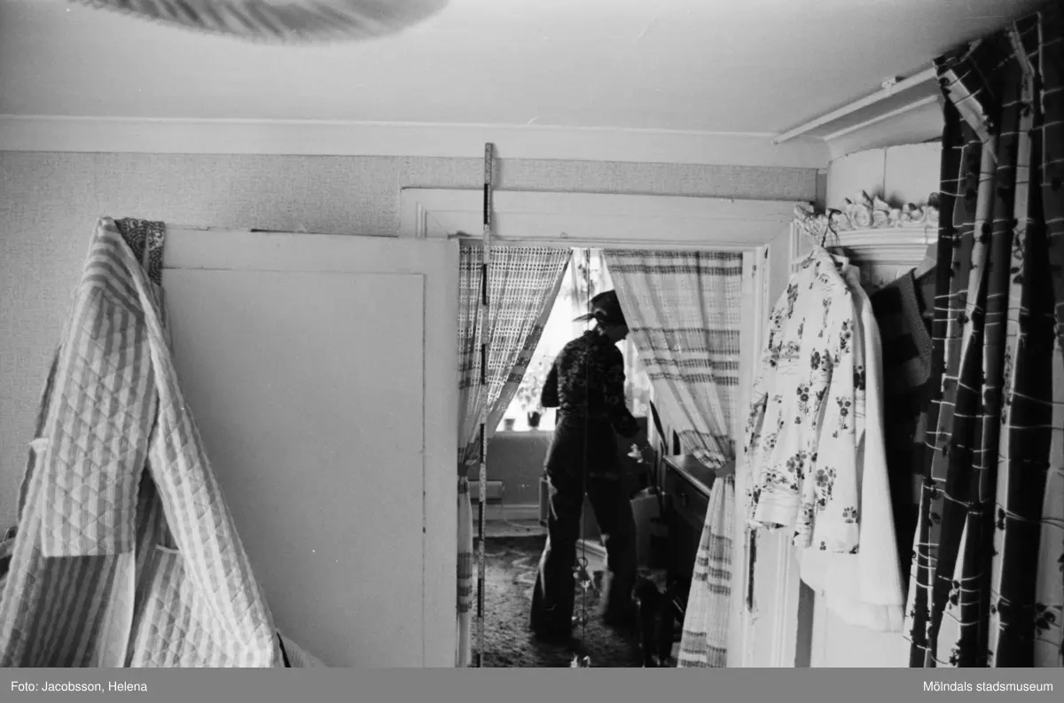 Titel: Interiörbild av bostadshus på Roten M 18 i Mölndals Kvarnby, 1972. Bostadshuset har en kvarvarande "brygga" utanför. Se bild 1991:1106.