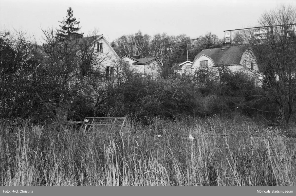 Vy från Järnvägsgatan mot ett hus vid Trädgårdsgatan, 30/1 1991.