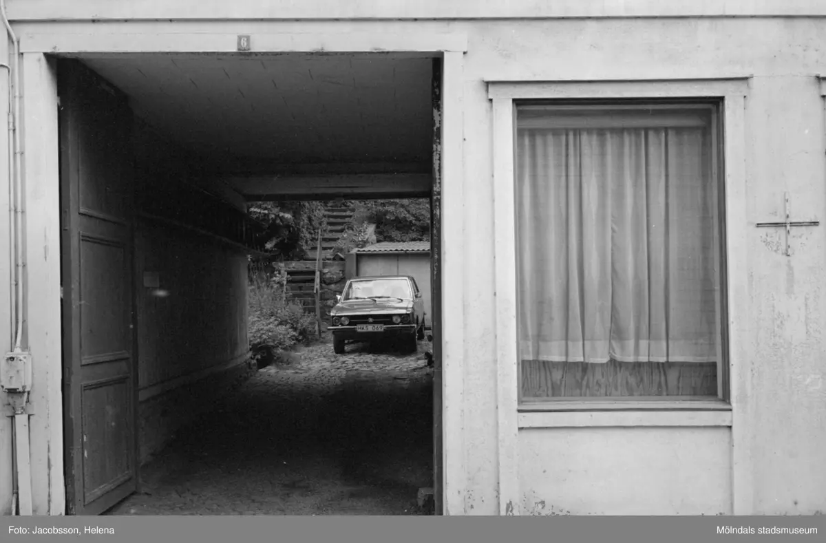 Roten M 1 i Mölndals Kvarnby. Exteriörbild av bostadshus. Infart.