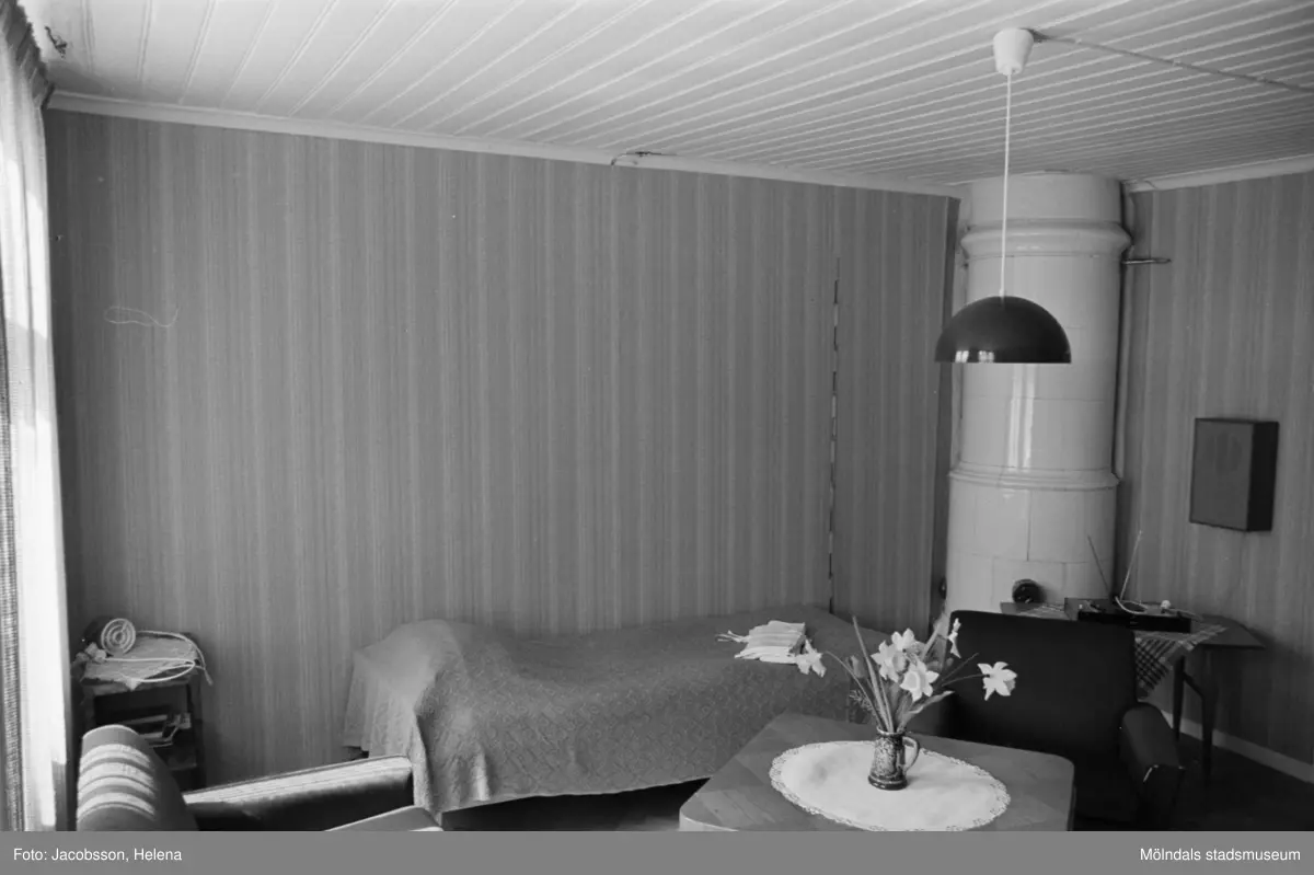 Roten L 13 i Mölndals Kvarnby. Lägenhetsinteriör från rotebostad. Kakelugn.