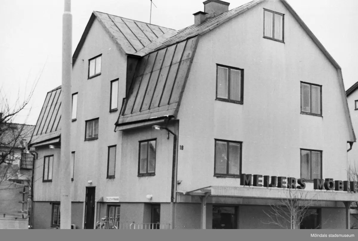 Köpman Bror Meijer ägde fastigheten på Barnhemsgatan 18 och hade här möbelhandel och biluthyrning (Meijers möbler och Biluthyrning). 1950-70-tal.