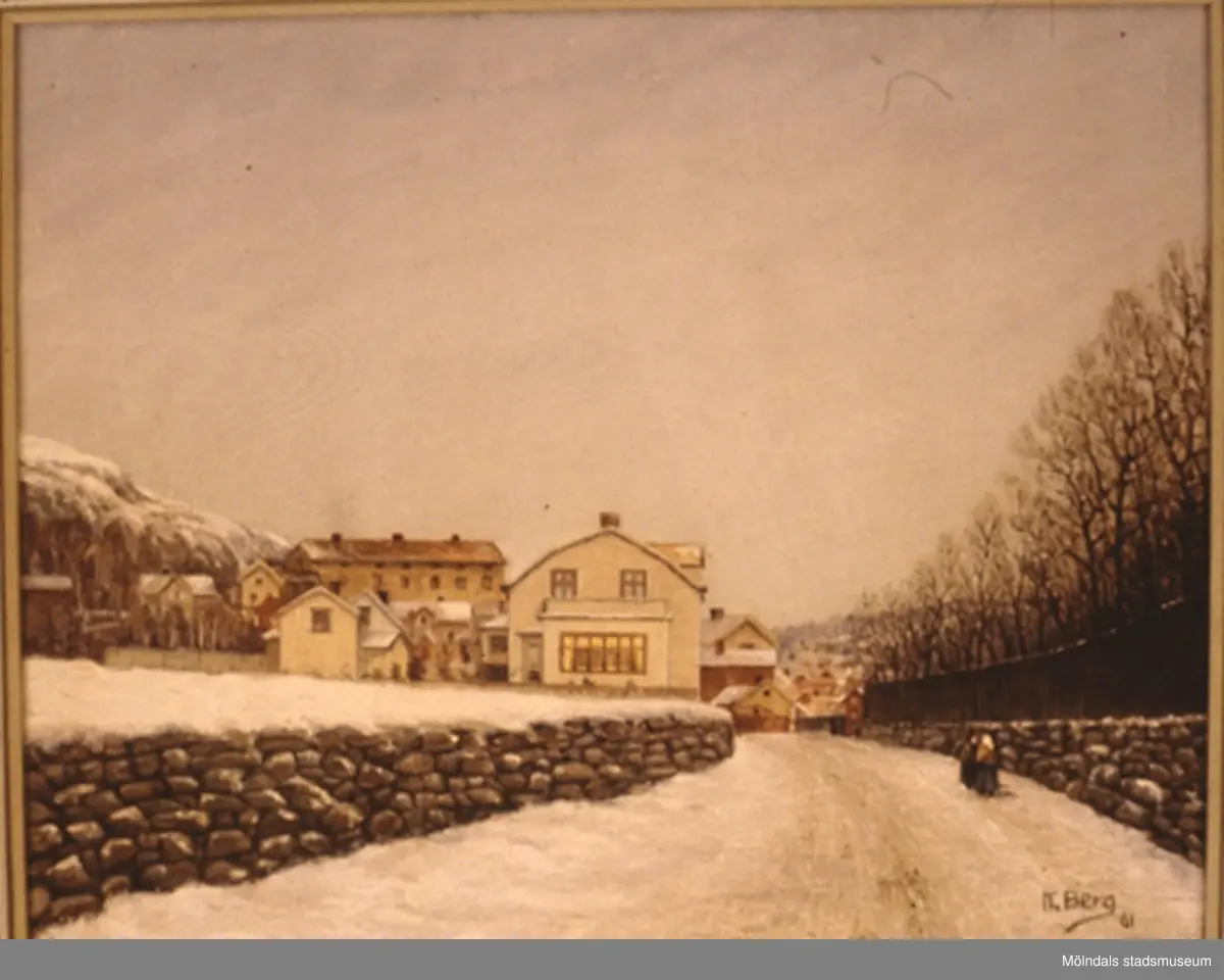 Titel: Bostadshus i Mölndal. En tavla målad av den naivistiske mölndalskonstnären Knut Berg.