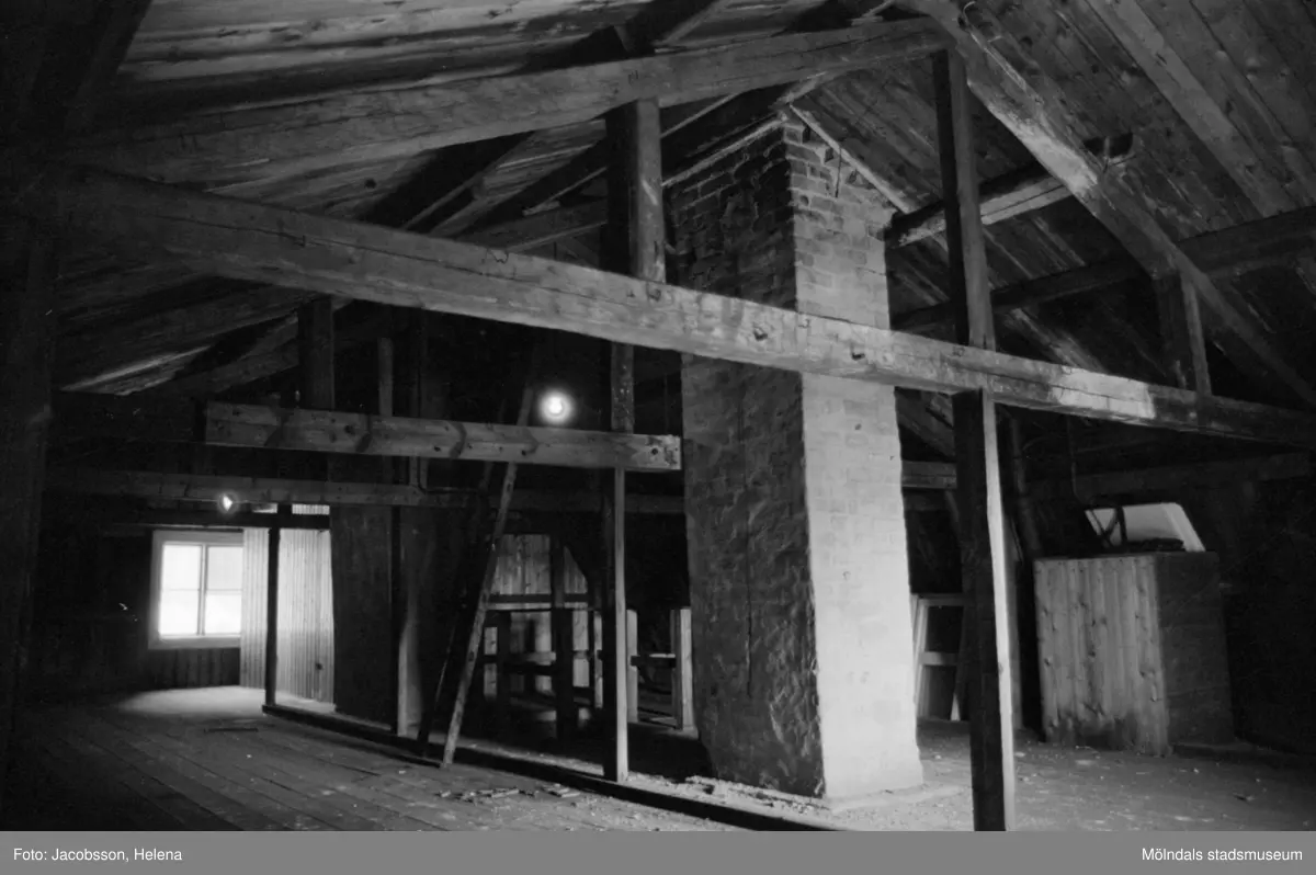 Interiör: vindsloft. Träkonstruktion, "takstolar".
