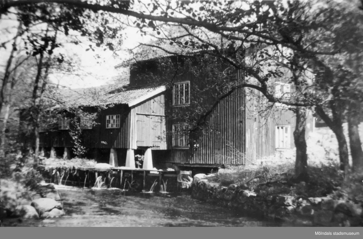 Kvarnen i Lindome med ålkistor i Lindomeån, 1950-talet.