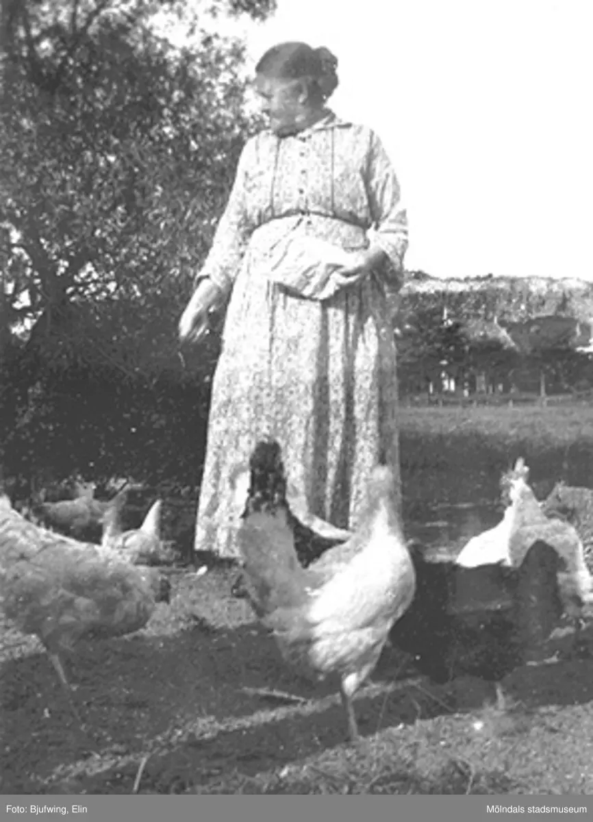 Josefina Andersson matar hönsen, 1925.