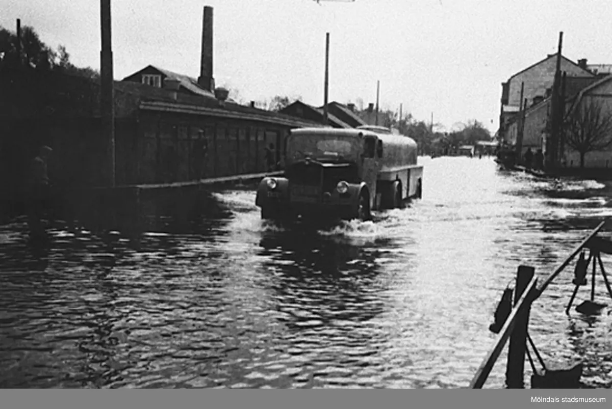 Översvämning i Mölndals centrum, okänt årtal. En bil med släp tar sig fram i vattnet. Vid husen står människor.