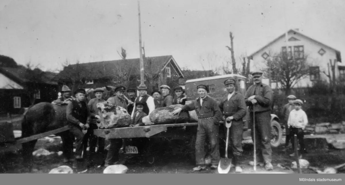 Arvid Svensson står och håller en sten på flaket. Resten av arbetarna är okända för givaren.
