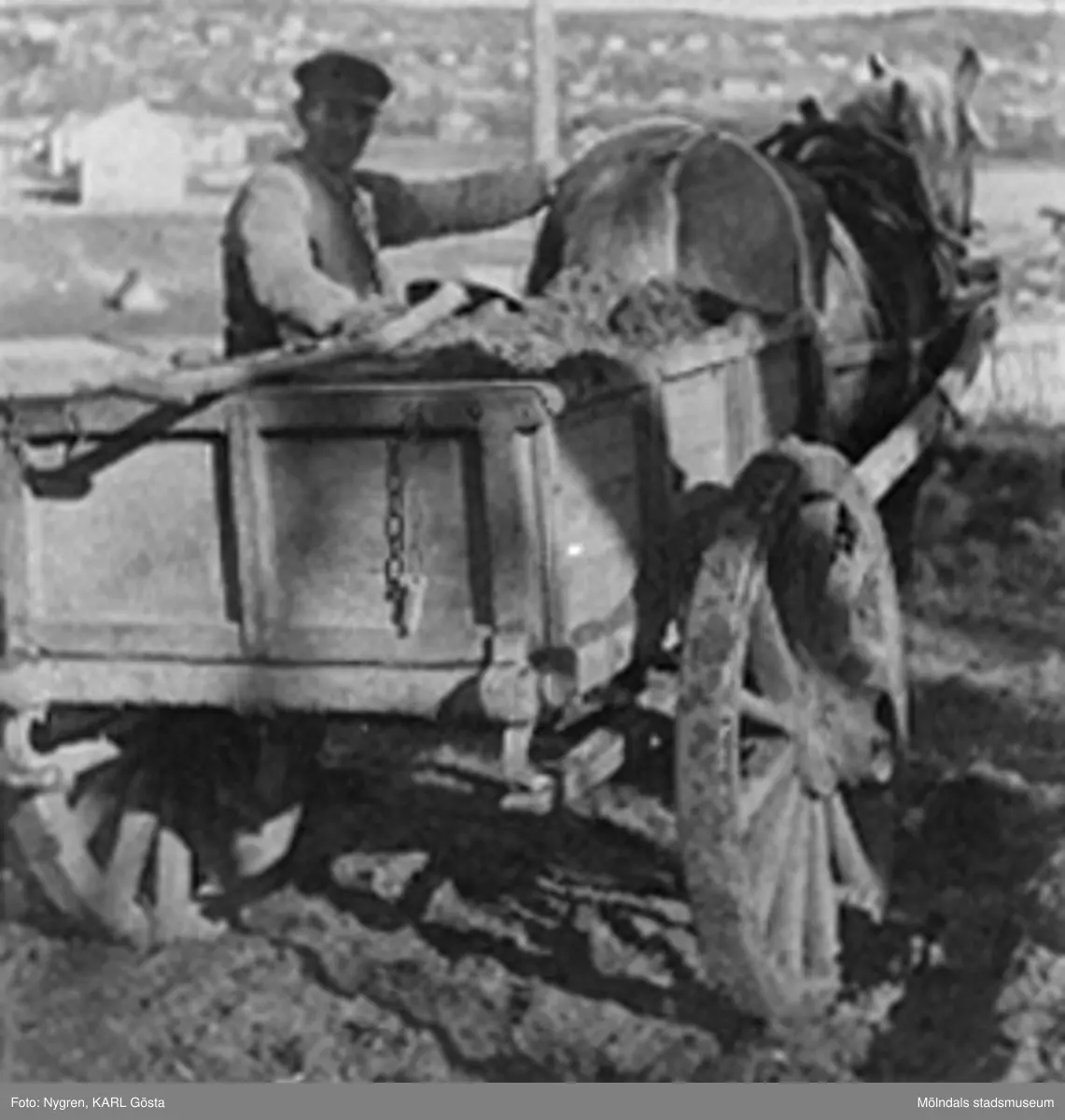 Ta kort på mig och "Märra" sa åkare Svensson, det gjorde Karl. Då kortet togs var det en period då det var svårt med mat. Karl och hans fru Lilly, odlade potatis på en kommunal lott. Karls pappa bannade dom, eftersom det mest växte ogräs på odlingslotten.