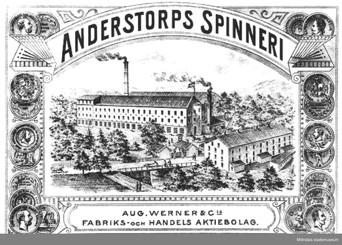 Etikett med teckning av gamla fabriken (ca 1830-tal). Text på etiketten: "Anderstorps spinneri, Aug. Werner & Cis Fabriks- och Handelsaktiebolag".