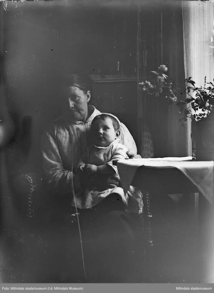 I hemmiljö där en äldre kvinna sitter med ett litet barn i knäet, troligtvis 1920-30-tal.