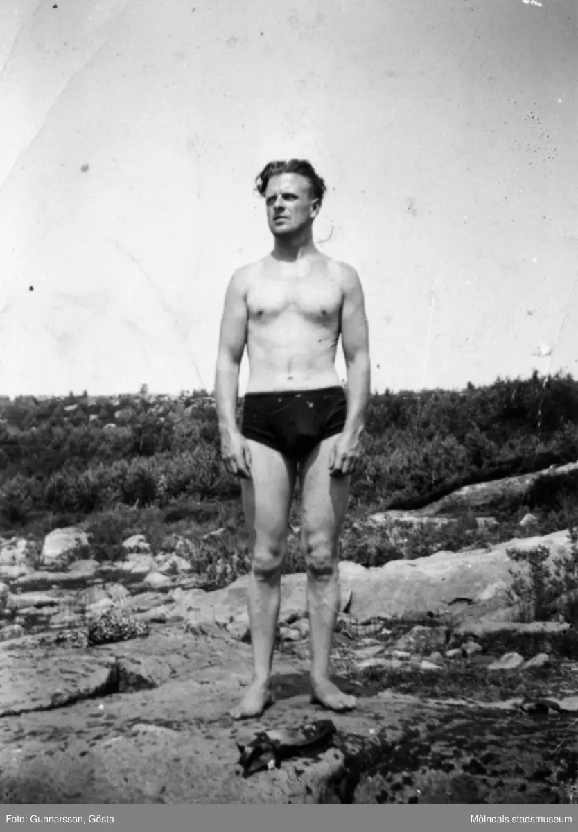 Helmer Garthman poserar i badbyxor vid Näset, 1930-tal.