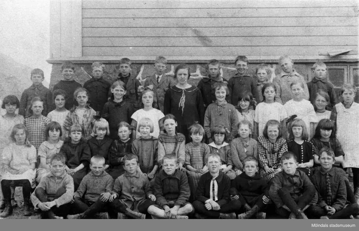 Skolklass med pojkar och flickor uppställda utomhus med lärarinnan i mitten. Toltorpsskolan i Mölndal år 1925.