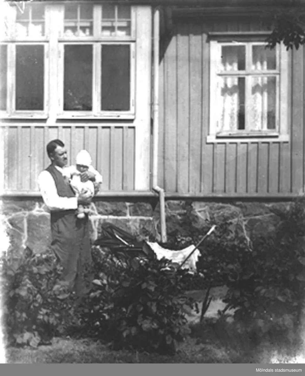 En man håller ett barn i famnen på Fässbergsgatan 31 i Toltorpsdalen. 1920-tal.