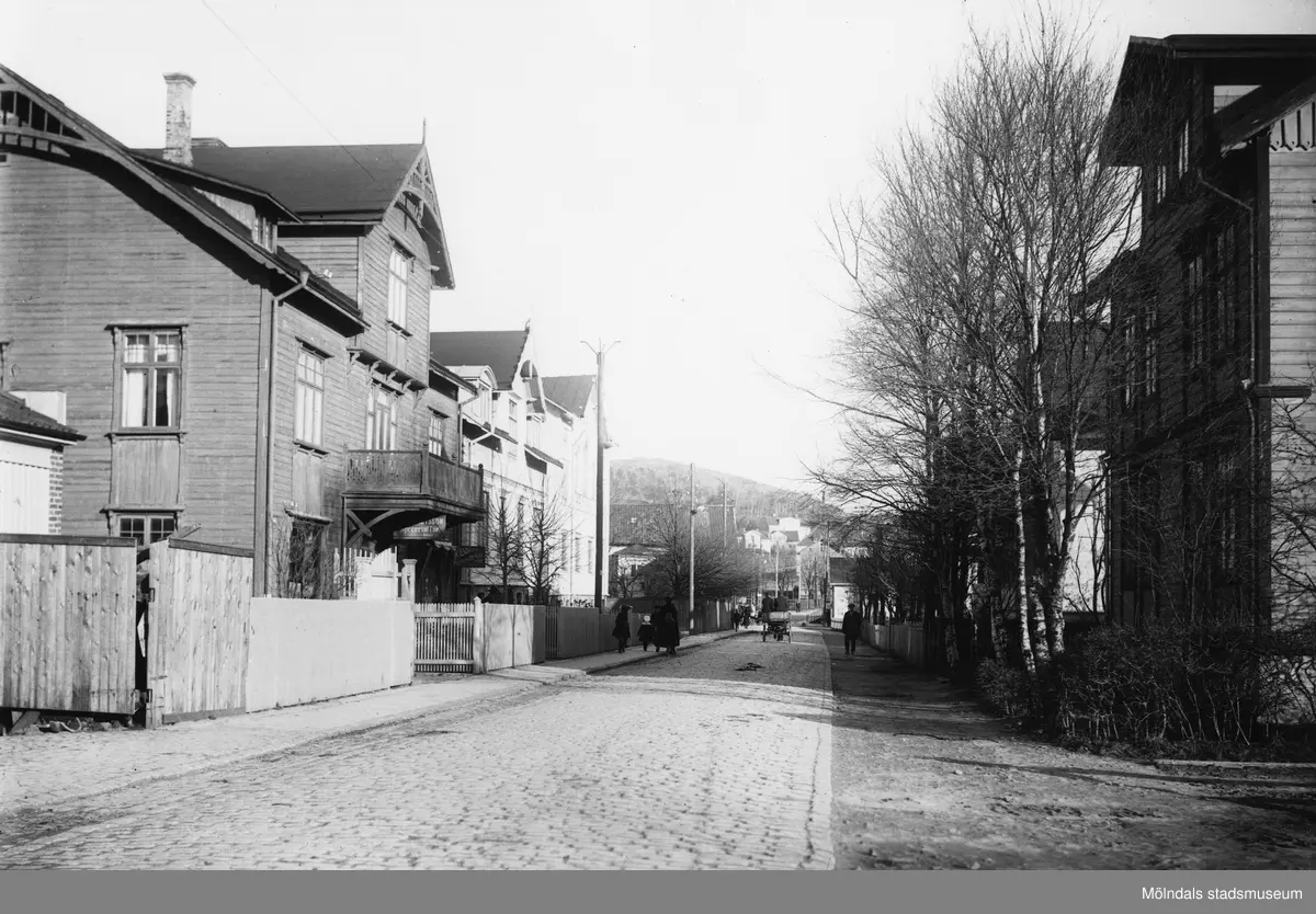 Den gamla stenlagda Frölundagatan (nu Brogatan) i riktning mot Mölndals bro, fotograferad 1921-11-02.