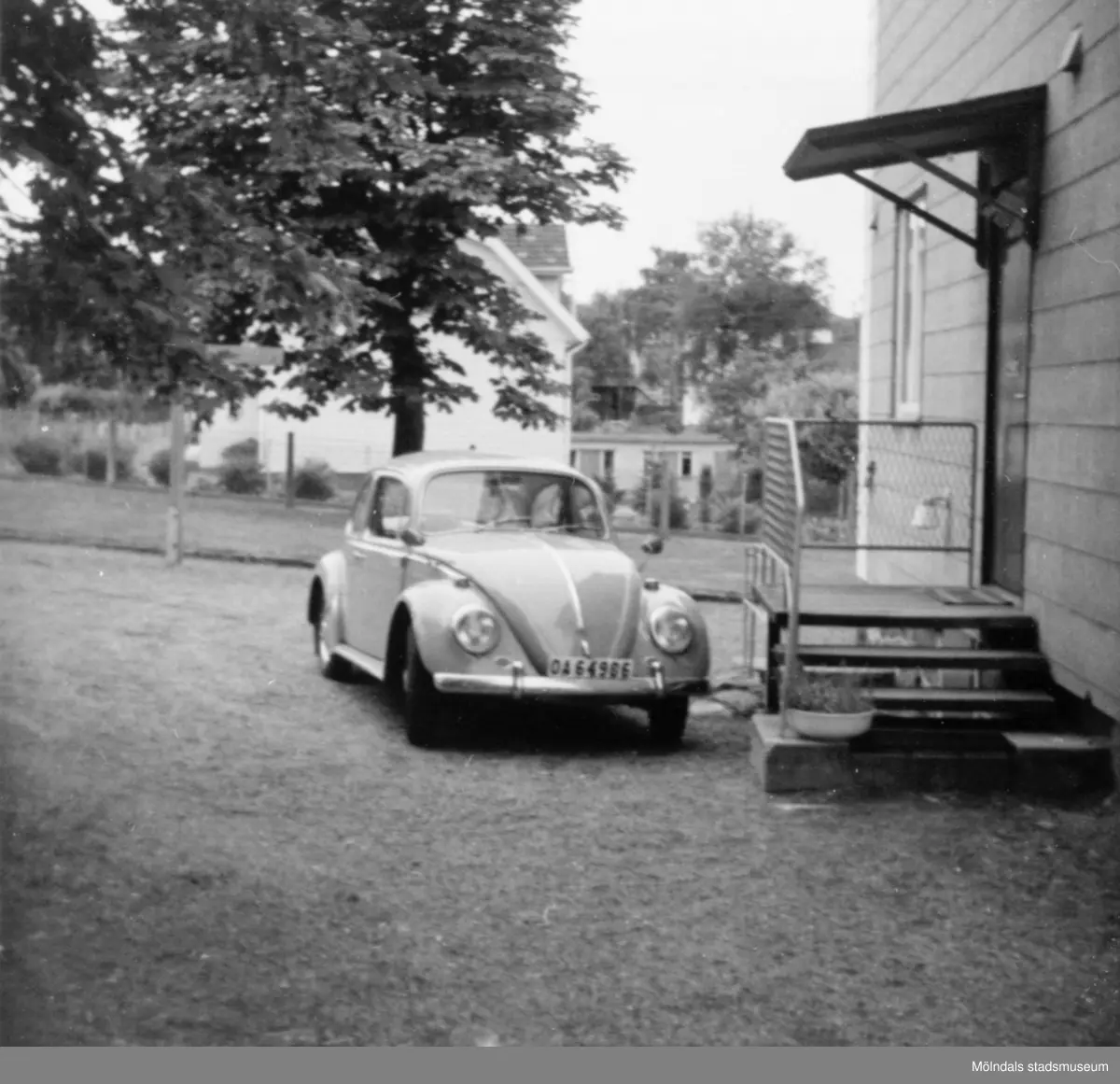 En folkvagn utanför entrén till en av Papyrus arbetarbostäder på Brunnsgatan 1-9. I bakgrunden syns Klevgatan 2. 1960-tal.