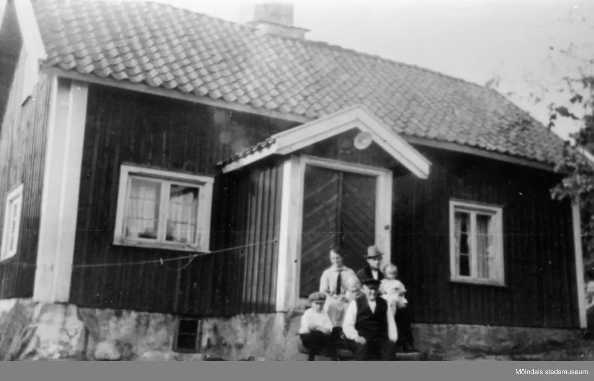 En familj sitter samlade på trappan till stugan i Anderstorp.