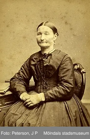 Halvfigursporträtt av en äldre, sittande kvinna, taget runt sekelskiftet 1900 i ateljé.