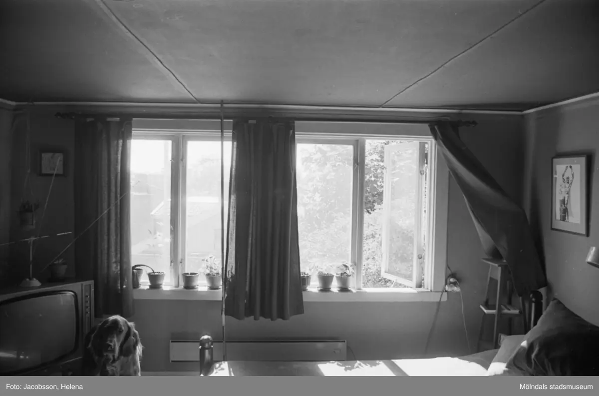 Bostadshus Roten M 10, okänt årtal. Interiörbild av ett rum med bl.a säng, tv och en hund.