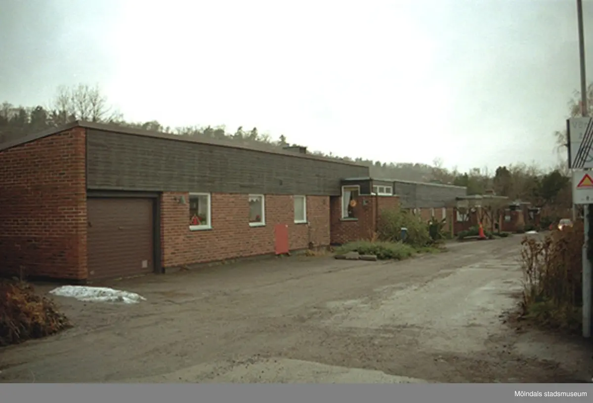 Byggnadsdokumentation. Vy från öster på röda tegelvillor i Toltorpsdalen. Fastigheterna: Ribbstolen (Stenhyddegatan) och Torpet (Västerbergsgatan), oktober 1998 - januari 1999.