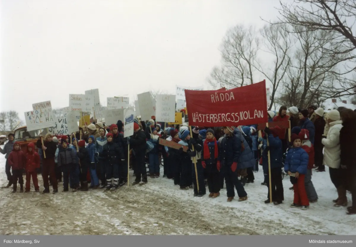 Demonstration för att hindra flyttning av Västerbergs mellanstadium vintern 1982. Fotografi ur album med signatur Siv Mårdberg.
