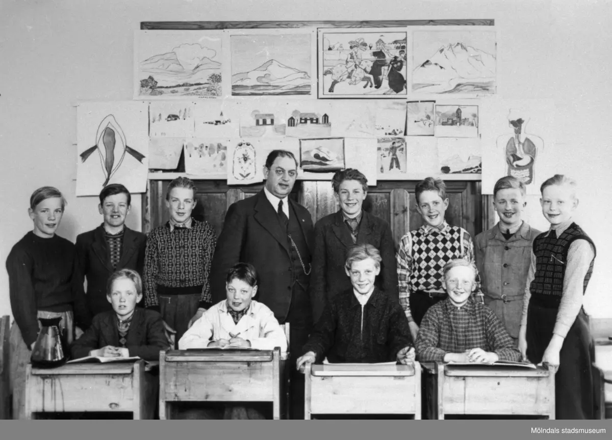 Pojkar sittande i bänkar och stående bakom. Magister Albert Sahlin med elever. På väggen sitter teckningar. Kvarnbyskolan i Mölndal år 1934.