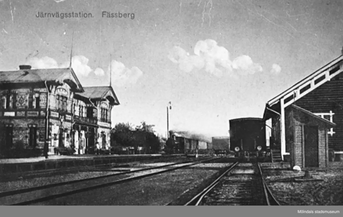 Vykort "Järnvägsstation. Fässberg" sedd från nordväst, cirka 1910 (Mölndals nedre, järnvägsstationen vid Hallandsbanan),