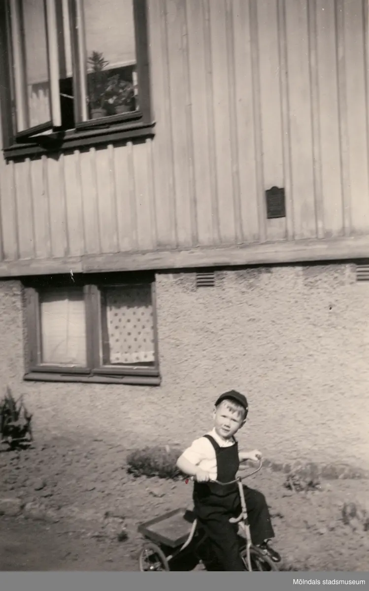 Thore Kristoffersson cyklar på trehjuling utanför huset Frölundagatan 20-22 i Mölndal, ca 1948-1949.