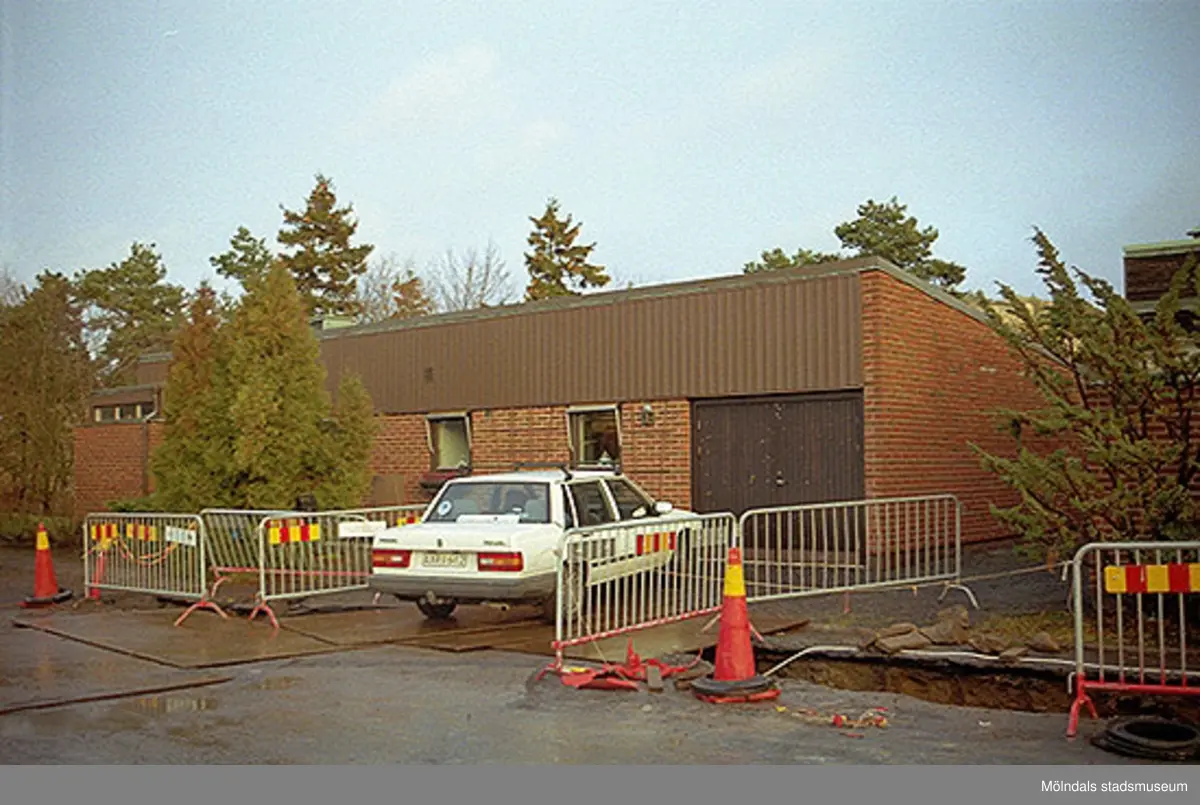 Byggnadsdokumentation. Vy från väster på fastigheterna Ribbstolen och Torpet i Mölndal. Villa med garageinfart och parkerade bilar utanför samt pågående vägrenovering. Oktober 1998 - januari 1999.