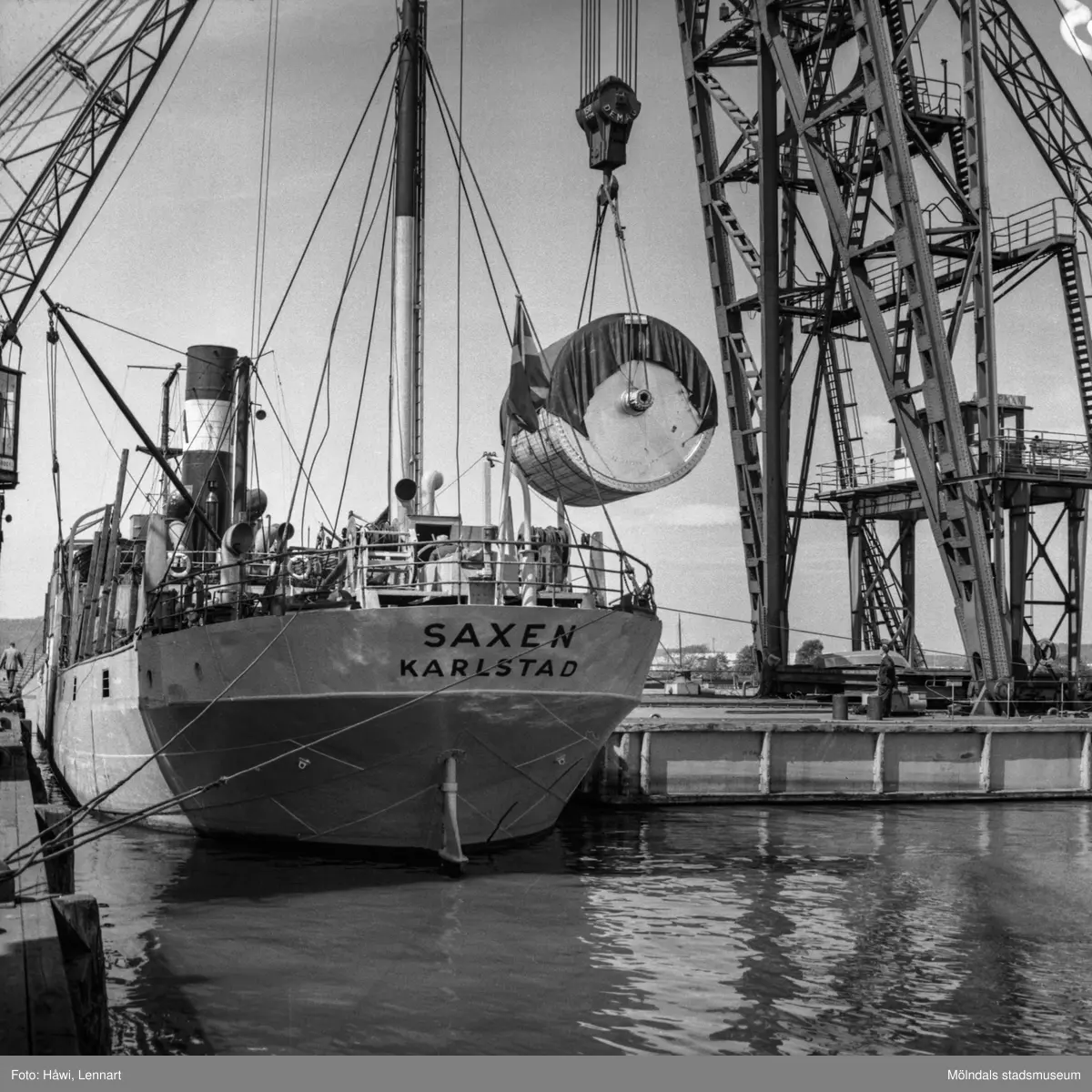 Transport av pappersbruket Papyrus PM2 yankeecylinder. Cylindern hissas upp med lyftkran i Göteborgs hamn, 2/6 1956.