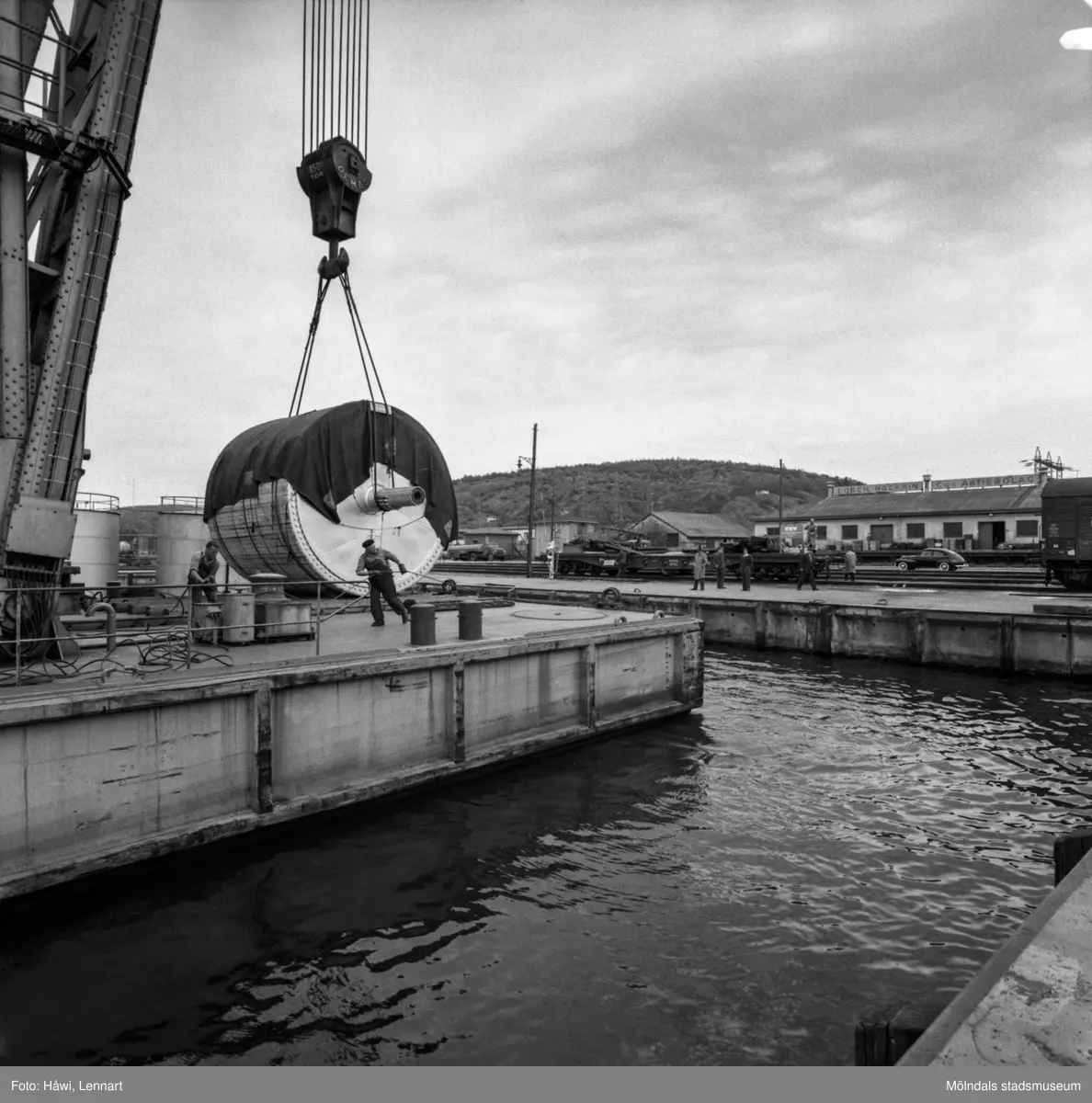 Transport av pappersbruket Papyrus PM2 yankeecylinder. Cylindern fraktas med flytande lyftkran i Göteborgs hamn, 2/6 1956.
