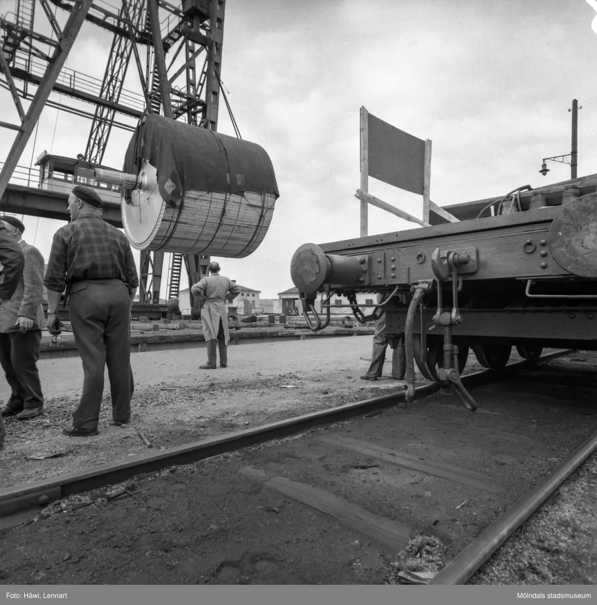 Transport av pappersbruket Papyrus PM2 yankeecylinder. Cylindern fraktas med flytande lyftkran i Göteborgs hamn, 2/6 1956.