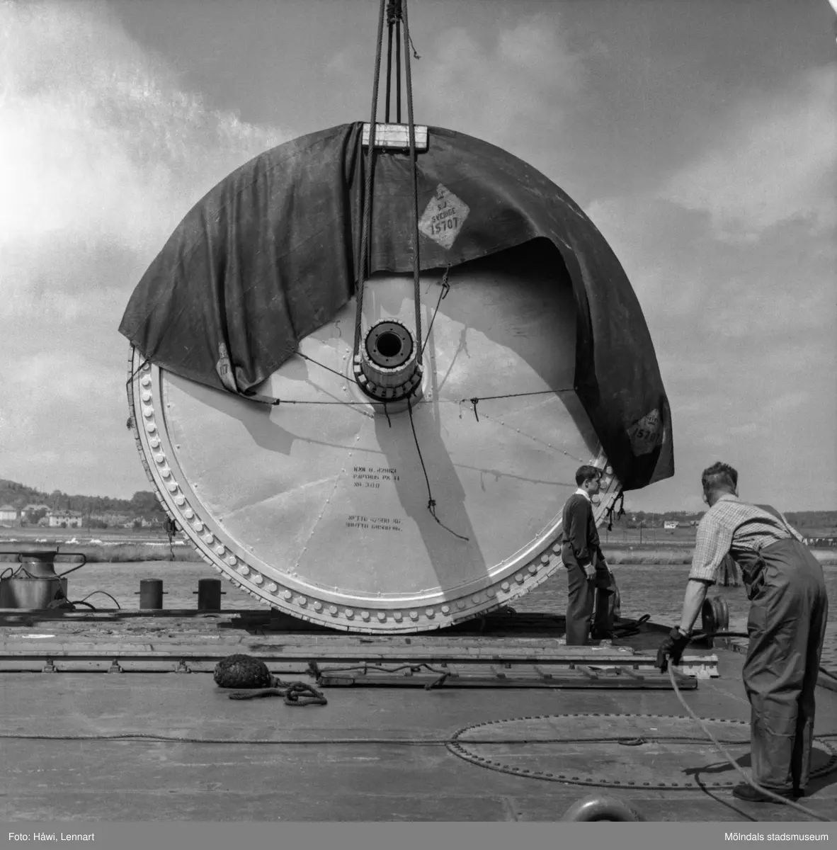 Titel: Transport av pappersbruket Papyrus PM2 yankeecylinder. Cylindern fraktas med flytande lyftkran i Göteborgs hamn, 2/6 1956.