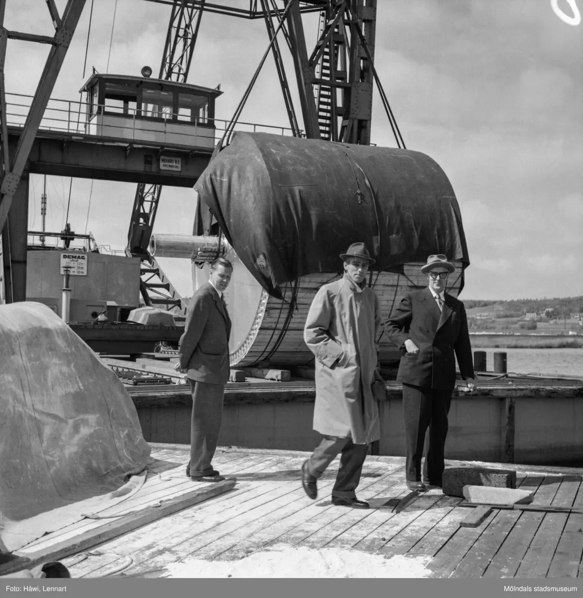 Titel: Transport av pappersbruket Papyrus PM2 yankeecylinder. Cylindern fraktas med flytande lyftkran i Göteborgs hamn, 2/6 1956.