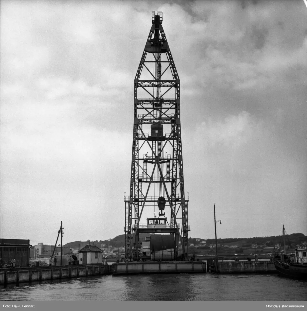 Transport av pappersbruket Papyrus PM2 yankeecylinder. Cylindern fraktas med flytande lyftkran i Göteborgs hamn, 2/6 1956.