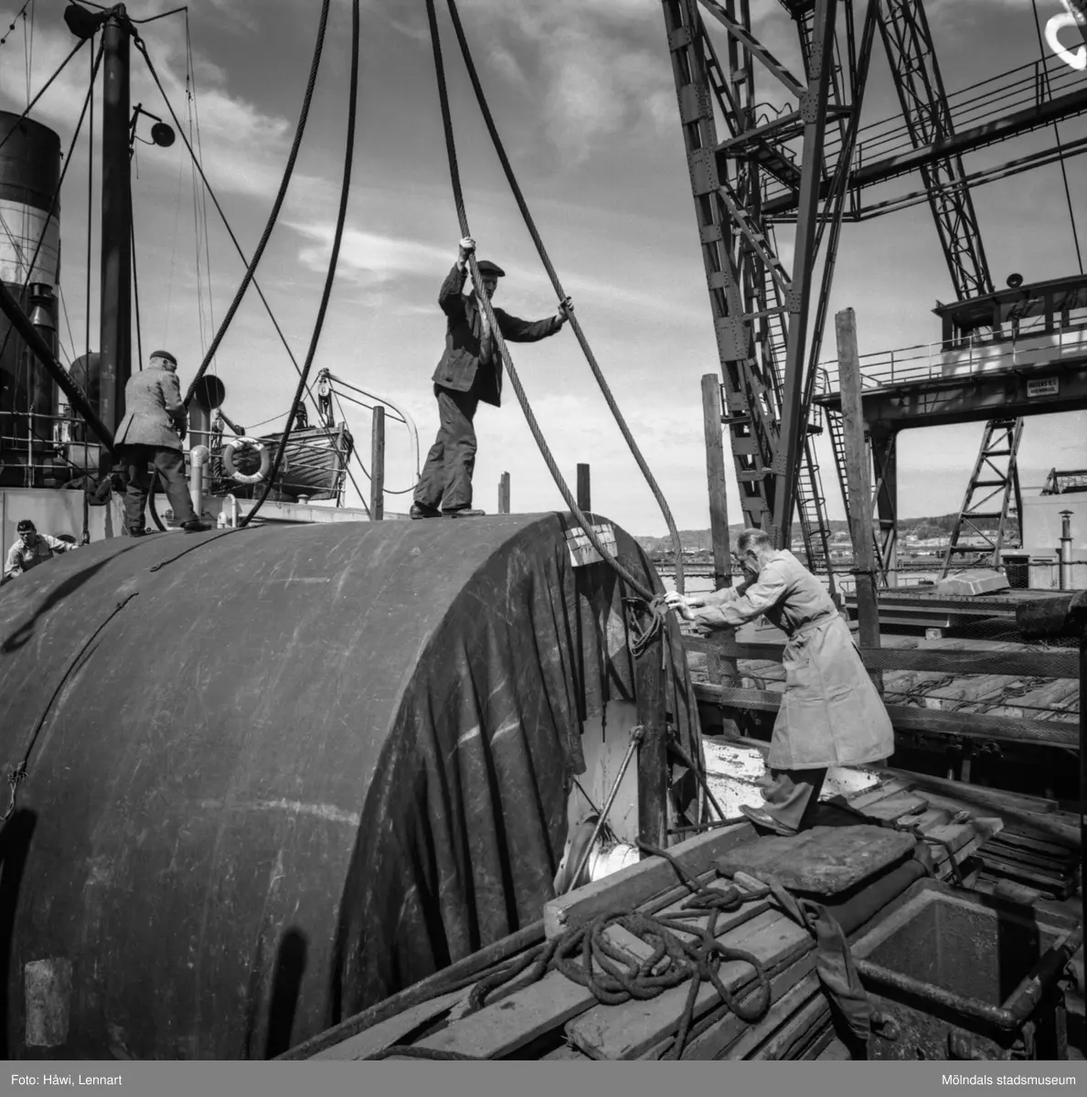 Transport av pappersbruket Papyrus PM2 yankeecylinder. Cylindern hissas upp med lyftkran i Göteborgs hamn, 2/6 1956.