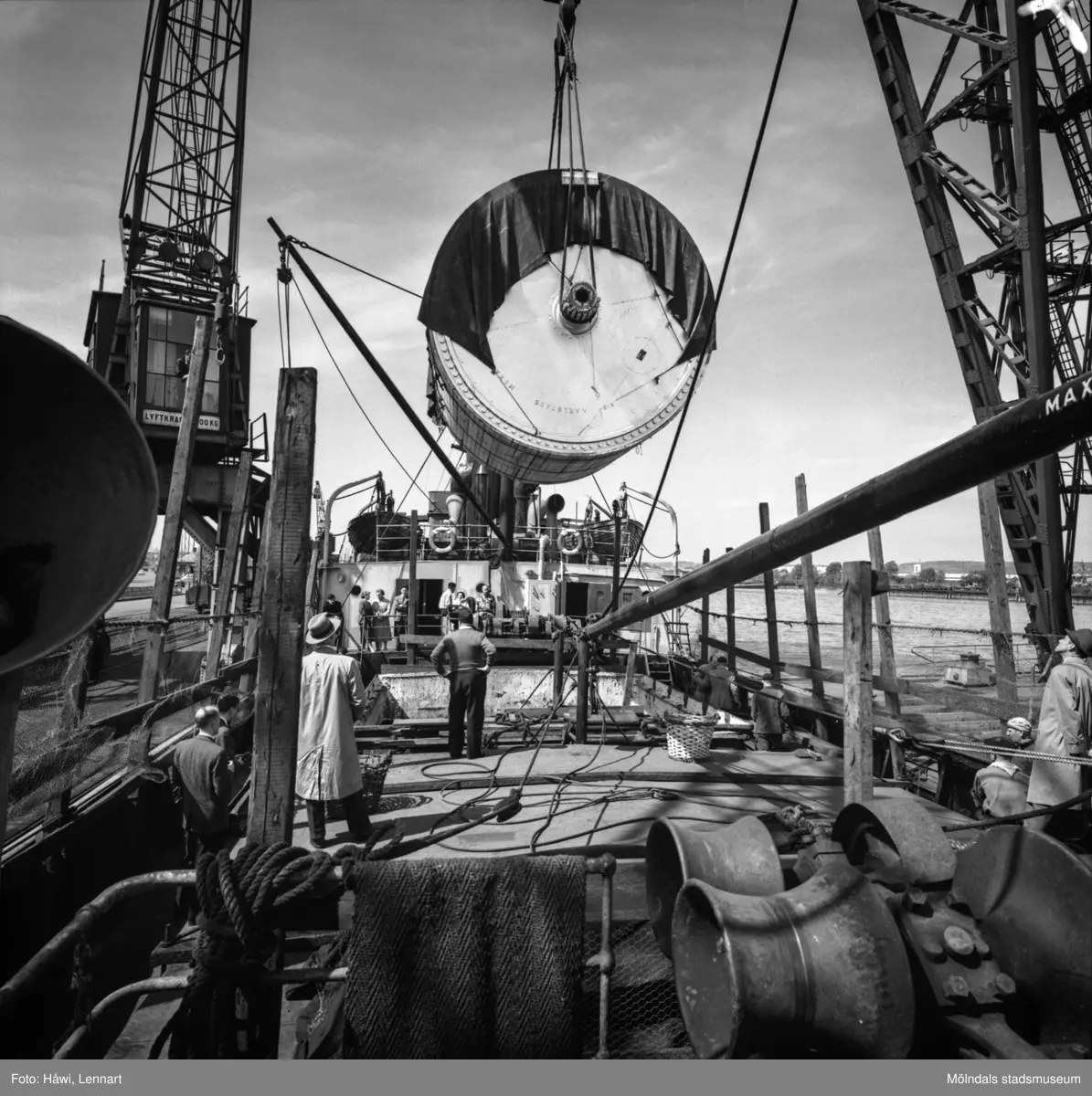 Transport av pappersbruket Papyrus PM2 yankeecylinder. Cylindern hissas upp med lyftkran i Göteborgs hamn, 2/6 1956.