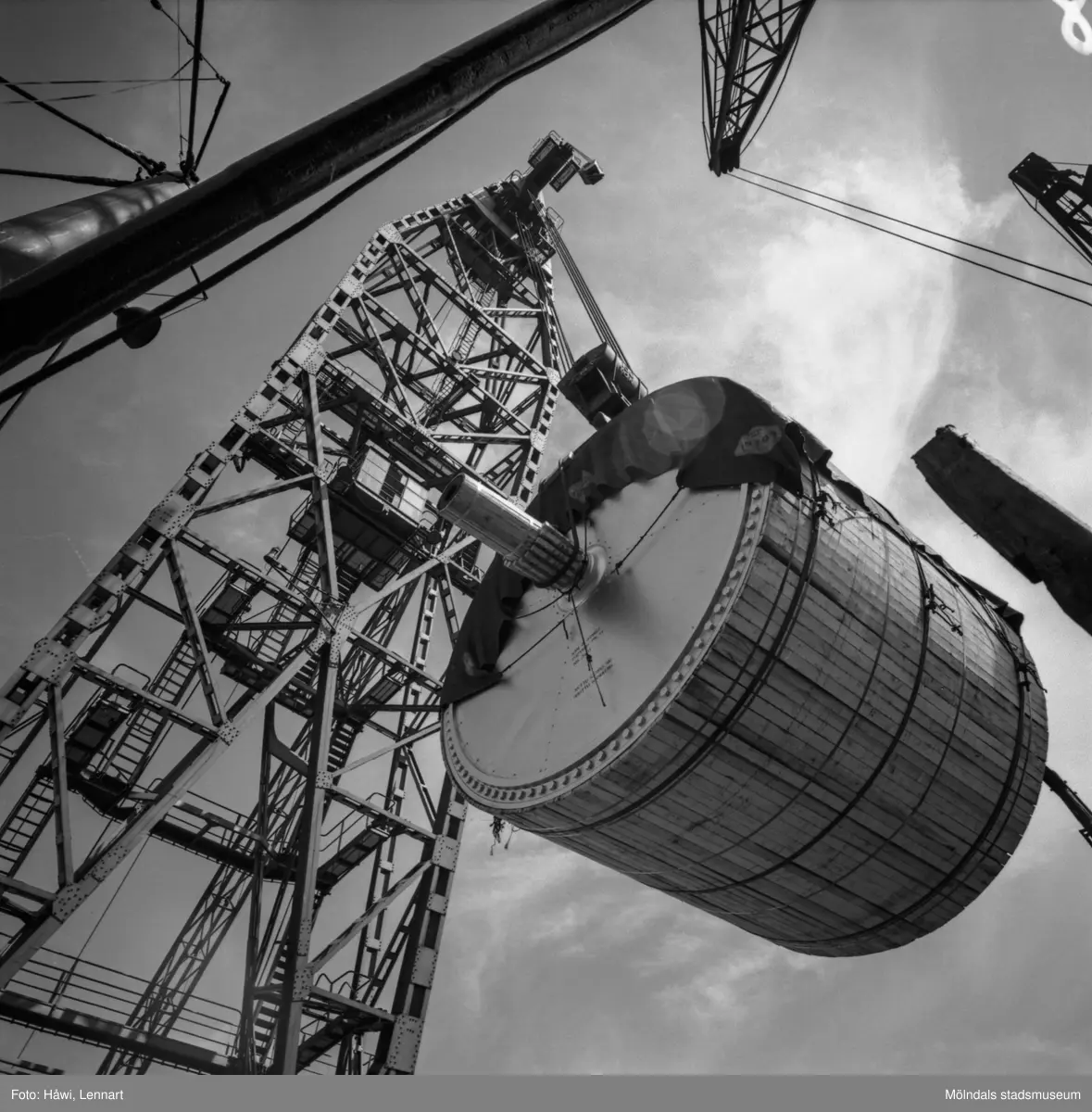 Transport av pappersbruket Papyrus PM2 yankeecylinder. Cylindern hissas upp med lyftkran i Göteborgs hamn, 2/6 1956.