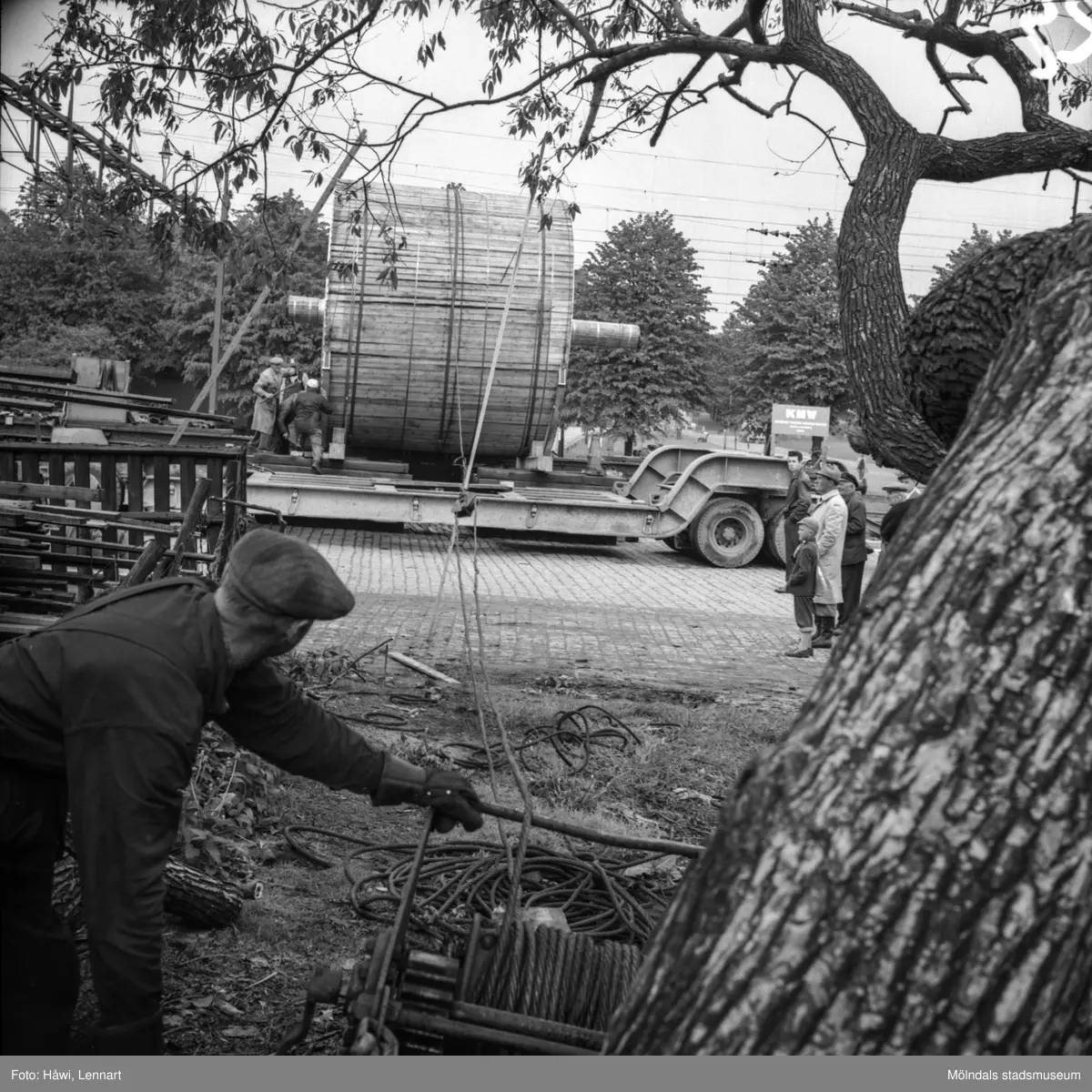 Transport av pappersbruket Papyrus PM2 yankeecylinder. Cylindern lastas från järnvägsvagn till lastfordon i Mölndal, 2/6 1956.