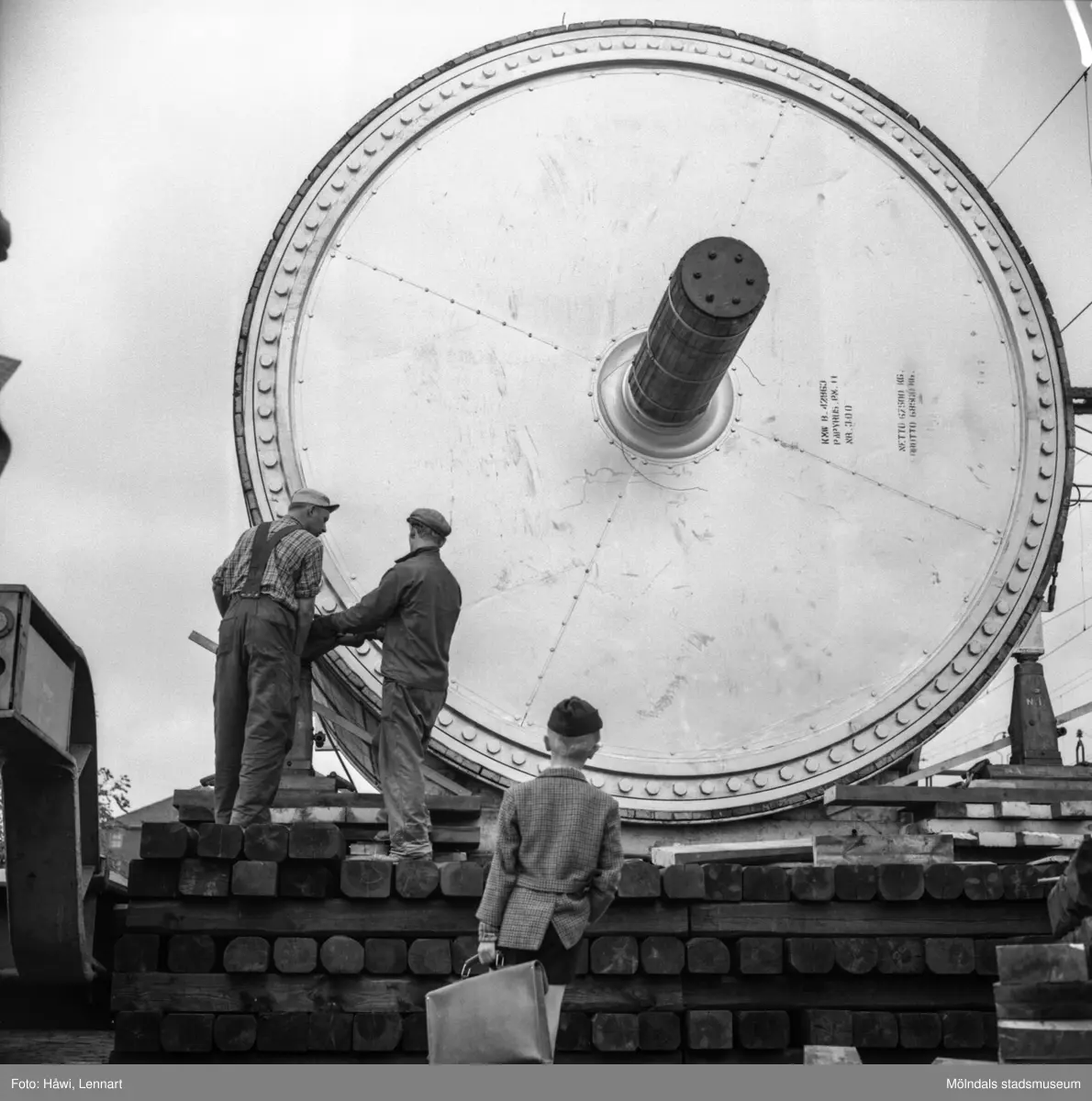 Transport av pappersbruket Papyrus PM2 yankeecylinder. Cylindern lastas från järnvägsvagn till lastfordon i Mölndal, 2/6 1956.