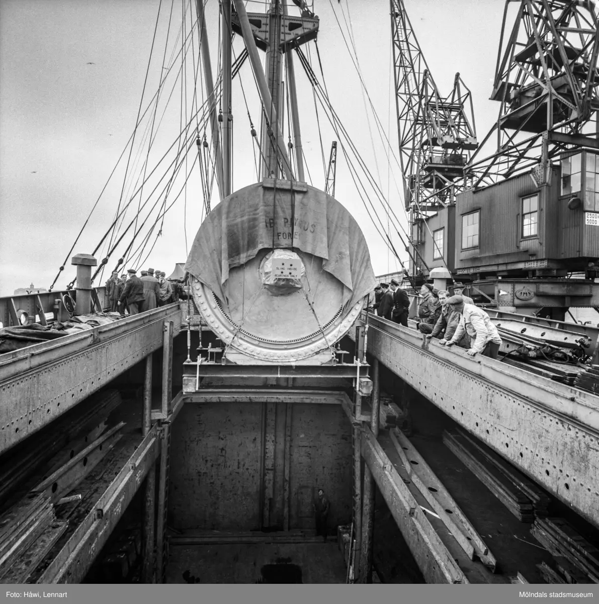 Transport av pappersbruket Papyrus PM2 yankeecylinder på fartyg. Göteborgs hamn, 16/4 1957.