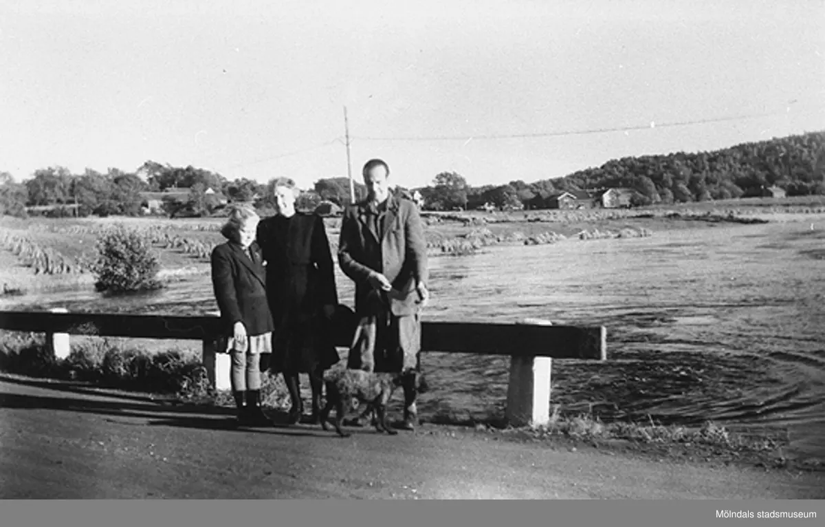 Ett barn, en kvinna och en man står med en hund i koppel vid en grusväg.