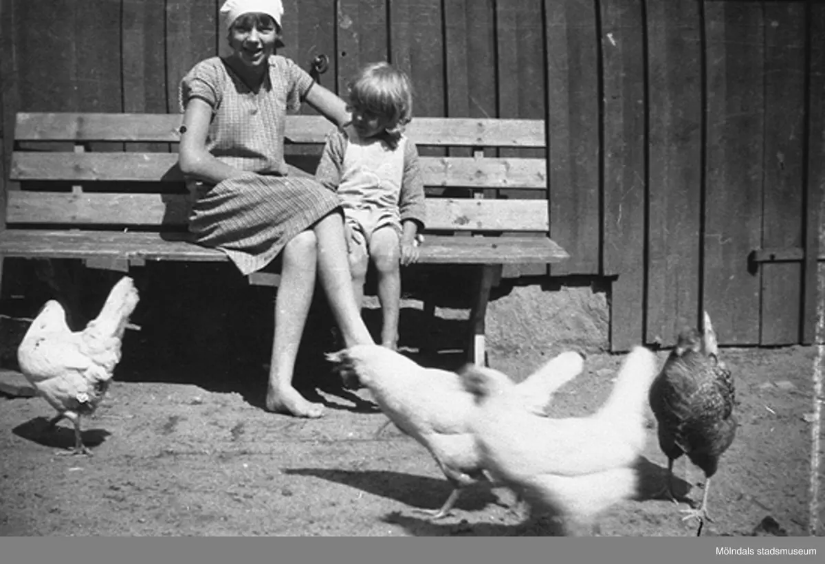 Sommar i Lindome i början av 1940-talet. En kvinna och ett barn sitter på en bänk. Framför dem går några hönor.