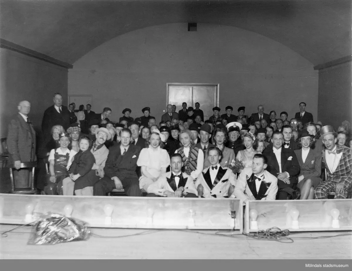 Grupporträtt på revyn "Rutigt och Brokigt" troligtvis med arbetare från Brandahls väskfabrik i Mölndal, 1943.
