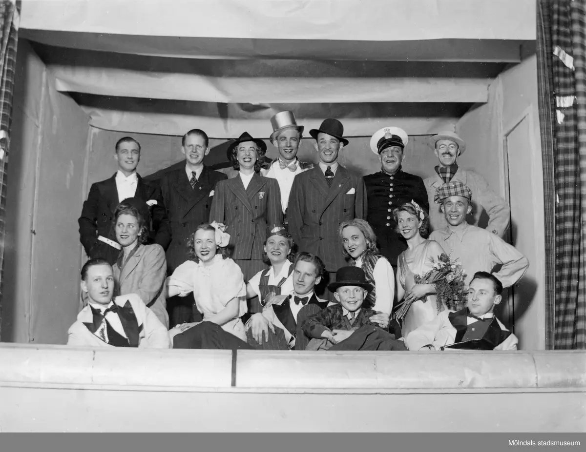 Grupporträtt på revyn "Rutigt och Brokigt" troligtvis med arbetare från Brandahls väskfabrik i Mölndal, 1943.
