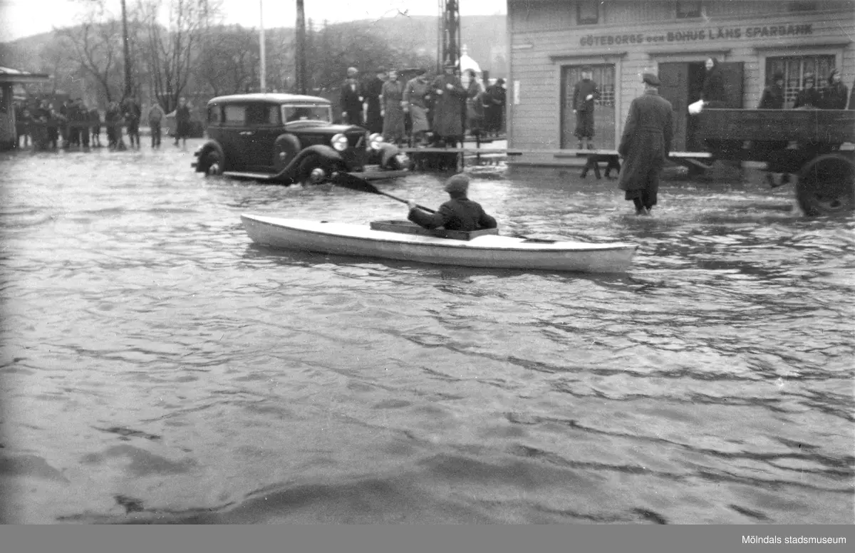 Översvämning i Mölndals centrum utanför Göteborg och Bohus läns sparbank.