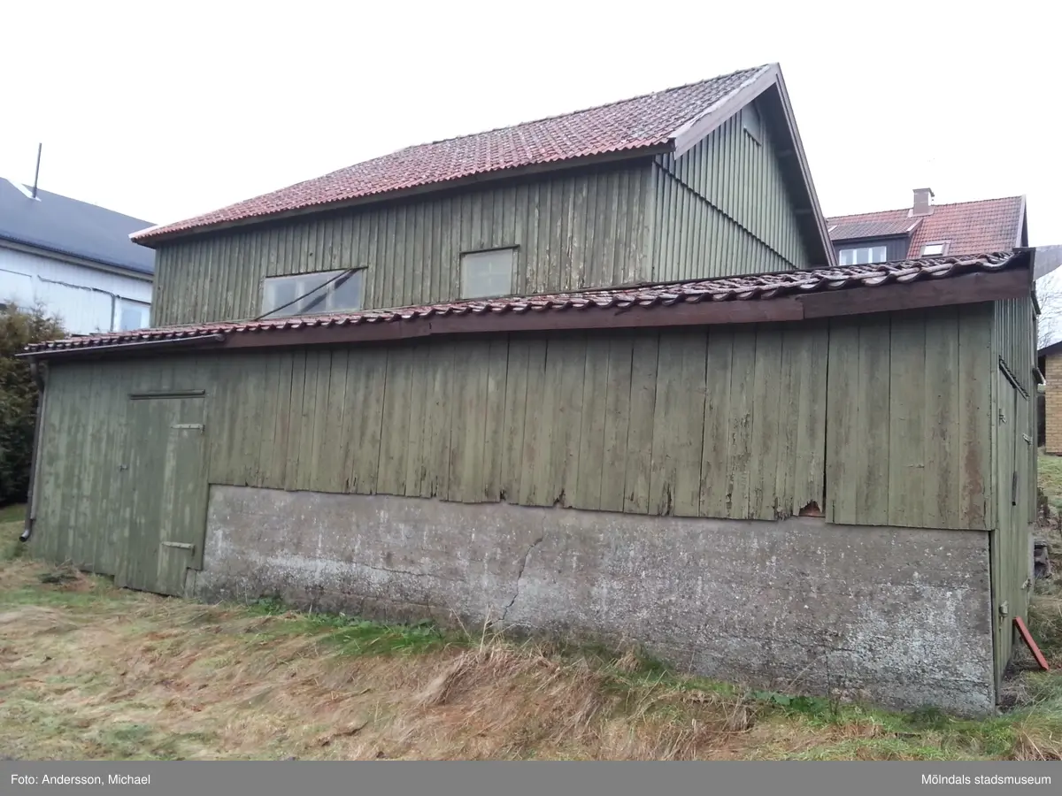 Titel: Grönmålad ladugård tillhörande fastigheten Annestorp 2:509, Annestorpsvägen 26 i Lindome. Fotografi taget den 27/1 2016. Byggnadsdokumentation inför rivning.