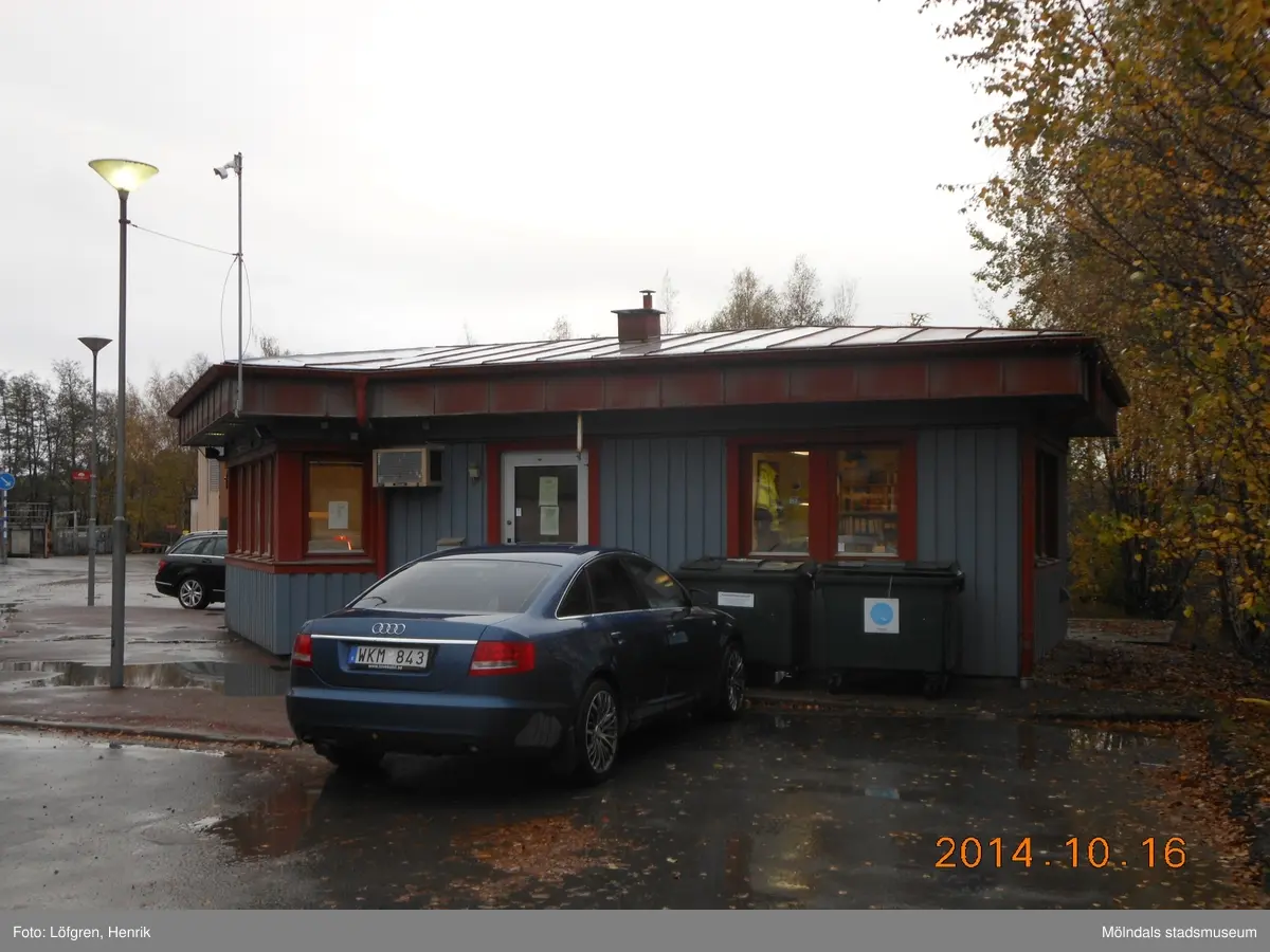 Kontorsbyggnad tillhörande fastigheten Backen 5:1 vid Sagsjövägen i Kållered. Vågkontor vid bergtäkten. Fotografi taget den 16/10 2014. Byggnadsdokumentation inför rivning.
