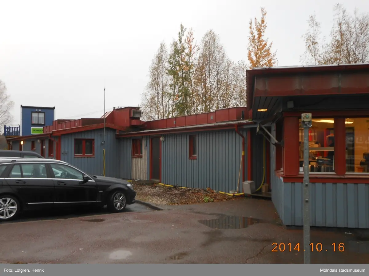 Titel: Kontorsbyggnad tillhörande fastigheten Backen 5:1 vid Sagsjövägen i Kållered. Vågkontor vid bergtäkten. Fotografi taget den 16/10 2014. Byggnadsdokumentation inför rivning.