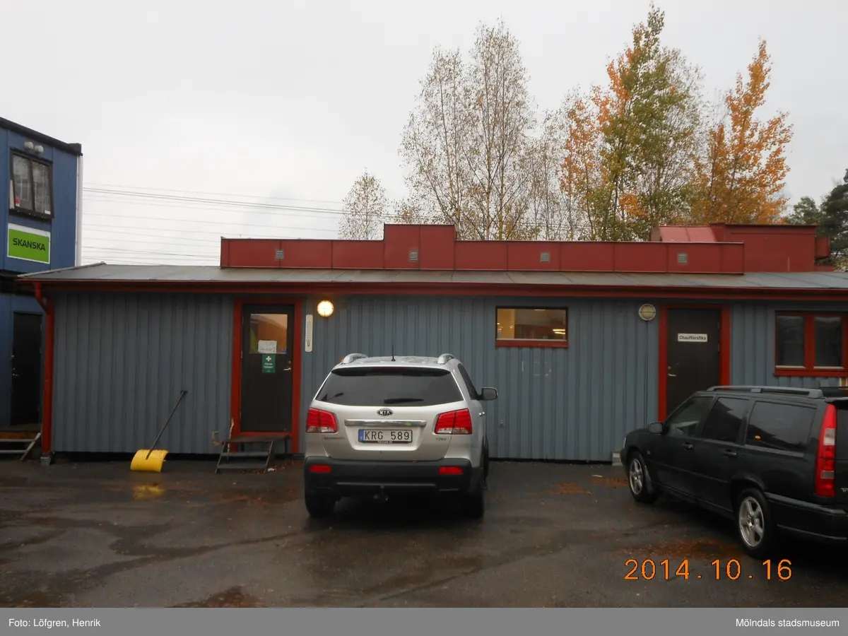 Kontorsbyggnad tillhörande fastigheten Backen 5:1 vid Sagsjövägen i Kållered. Vågkontor vid bergtäkten. Fotografi taget den 16/10 2014. Byggnadsdokumentation inför rivning.