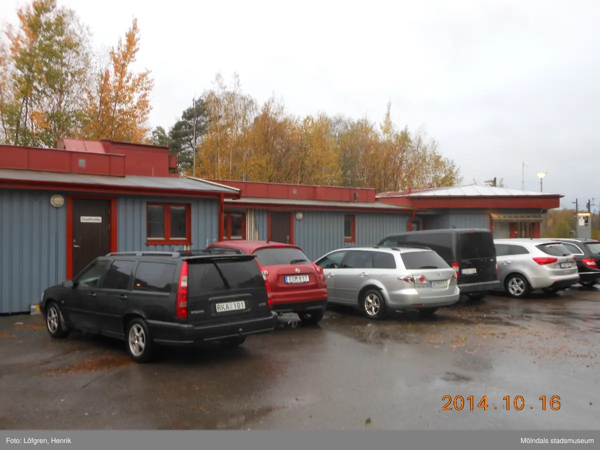 Kontorsbyggnad tillhörande fastigheten Backen 5:1 vid Sagsjövägen i Kållered. Vågkontor vid bergtäkten. Fotografi taget den 16/10 2014. Byggnadsdokumentation inför rivning.